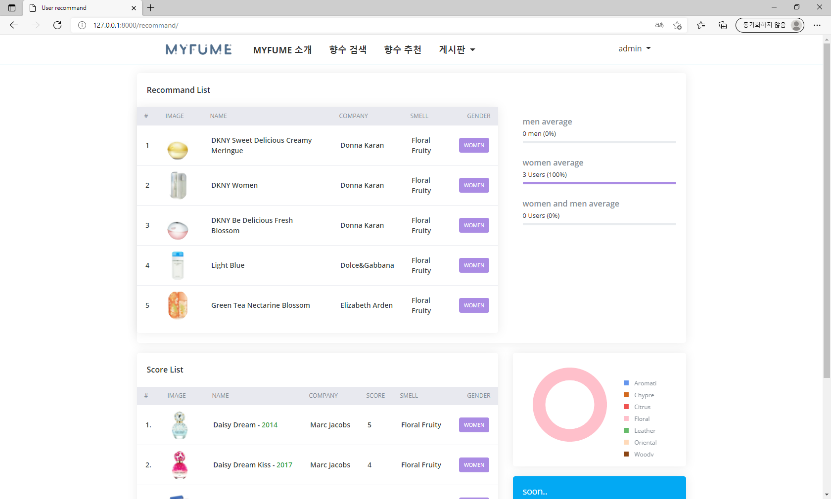 금번 새롭게 오픈한 마이퓸사이트는 각 개인 맞춤형 향수를 추천해주는 협업필터링의 추천 기술이 도입된 향수 추천 사이트 입니다.